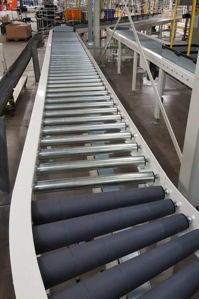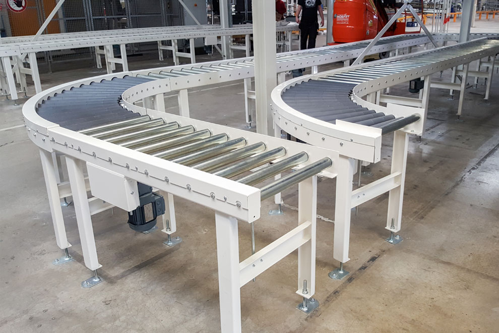 Rollenförderer werden durch ihre Effizienz in der Fördertechnik sehr oft eingesetzt. Typisch ist der Palettentransport, vorausgesetzt die Paletten werden in Längsrichtung transportiert. Je nach Dimension und Gewicht des Fördergutes wird die optimale Ausführung konstruiert. Das Grundmodell ist bei allen Rollenförderern gleich: Rahmen, Unterstützungen, Tragrollen, und Motorstation mit Getriebemotor. Der Antrieb der Tragrollen erfolgt über Doppelkettenräder von Rolle zu Rolle und gewährleistet eine optimale Kraftübertragung per Kettenkreise.