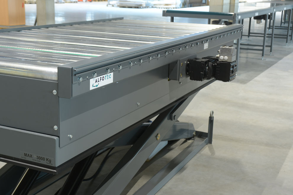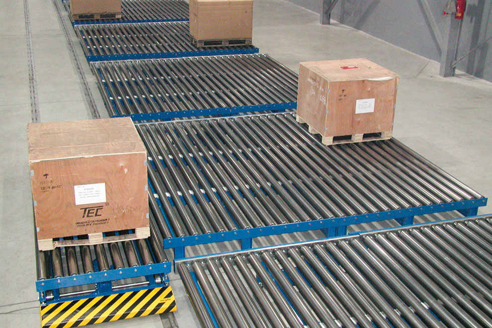 Rollenförderer werden durch ihre Effizienz in der Fördertechnik sehr oft eingesetzt. Typisch ist der Palettentransport, vorausgesetzt die Paletten werden in Längsrichtung transportiert. Je nach Dimension und Gewicht des Fördergutes wird die optimale Ausführung konstruiert. Das Grundmodell ist bei allen Rollenförderern gleich: Rahmen, Unterstützungen, Tragrollen, und Motorstation mit Getriebemotor. Der Antrieb der Tragrollen erfolgt über Doppelkettenräder von Rolle zu Rolle und gewährleistet eine optimale Kraftübertragung per Kettenkreise.